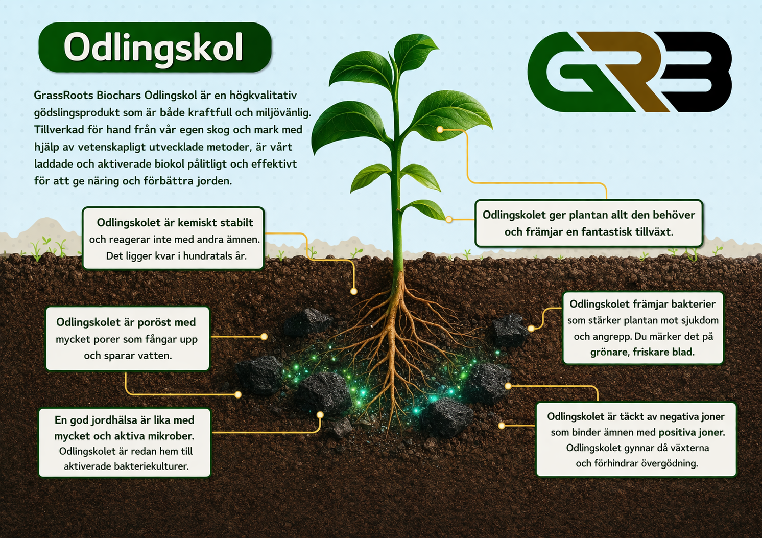 Odlingskol är ett långvarigt, naturligt gödsel med jordförbättringsegenskaper och en aktiverad bakteriekultur. Odlingskol är en förädlad biokolsprodukt och består utav biokol gjord på biomassa från vår egen skog, matjord, näringsämnen och mineraler. Näringen kommer främst från gödsel, mineraler och näring. Bakteriekulturen kommer ifrån matjord.